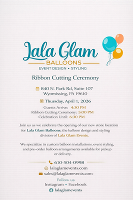 Lala Glam Events, founded by Carmen Zabala, is opening its new storefront in Wyomissing with a ribbon-cutting ceremony. The new location introduces Lala Glam Balloons, the balloon design and styling division of the company, specializing in custom balloon installations and event décor.